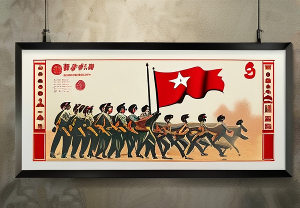 红色系是主题的精髓,但需避免俗套。用浅灰色打底,局部点缀朱红或深褐:标题框用褶皱纸模拟年代感,边框添加弹孔蜡笔画。例如以“白底+深褐边框”为基底,标题字采用老报纸风格字体。